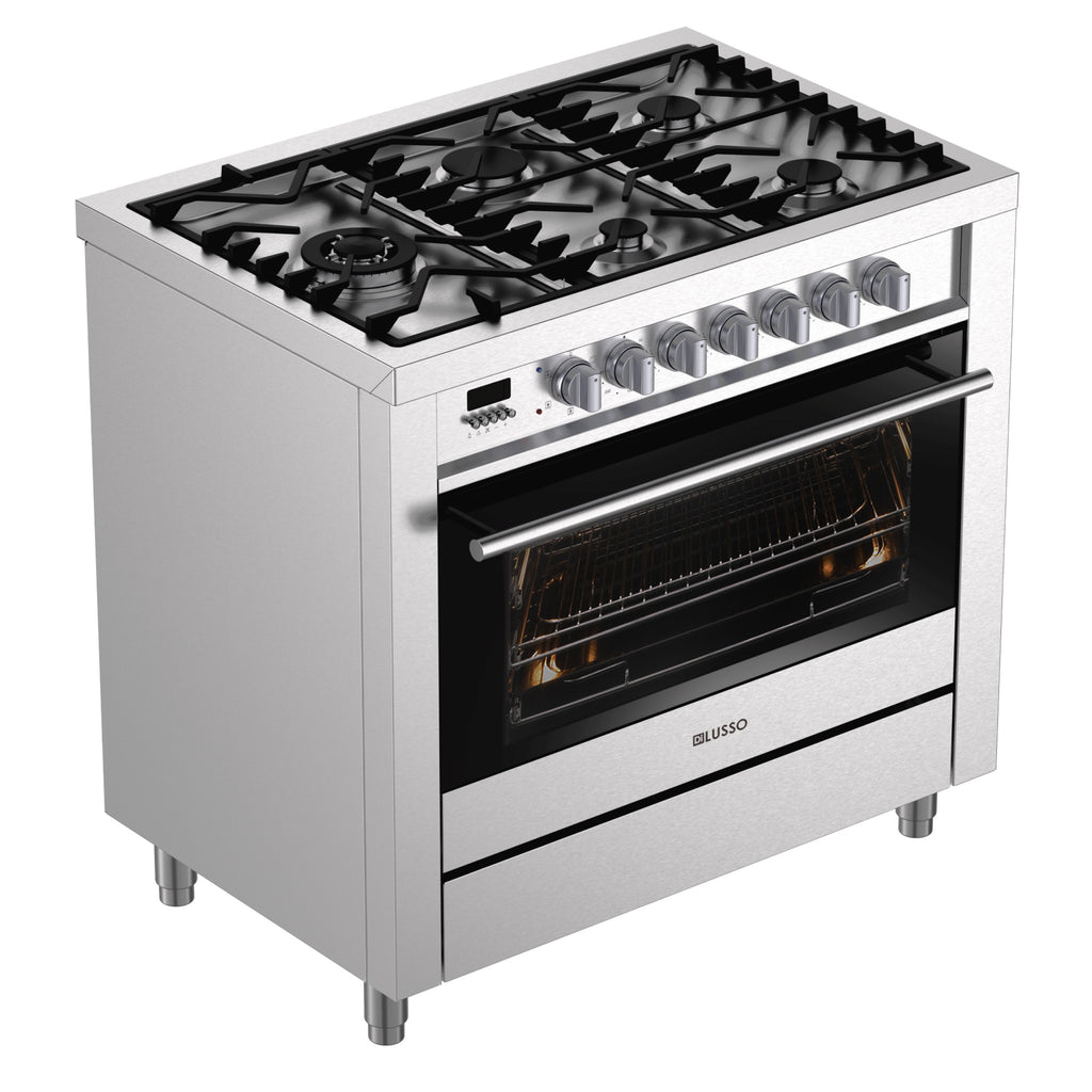 For the serious cook who wants the look of luxury. The Di Lusso 90cm freestanding cooker offers a 5 burner gas cooktop with a triple ring wok burner on the side to make the most of your cooktop space, sturdy cast iron trivets and stainless steel coloured knobs. The 10 function electric oven comes with 2 levels of telescopic rails, a triple glazed door and a handy storage drawer.