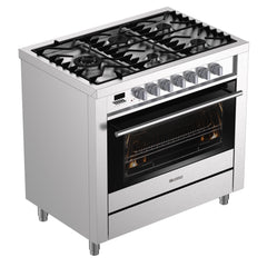 | HOB | 5 burner gas cooktop with side wok burner Cast iron trivets Triple ring wok burner Italian Sabaf burners Flame Failure Device on all burners Stainless steel coloured knobs Under knob ignition LPG converter Pull out storage drawer Height adjustable feet |