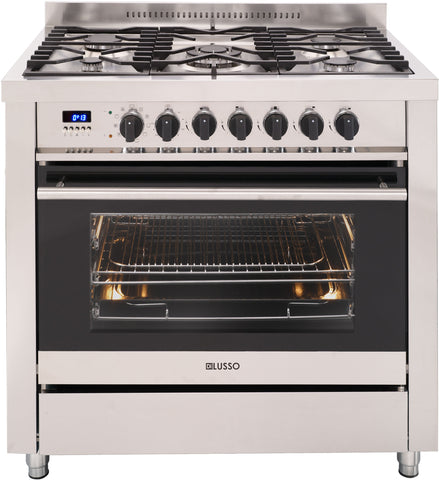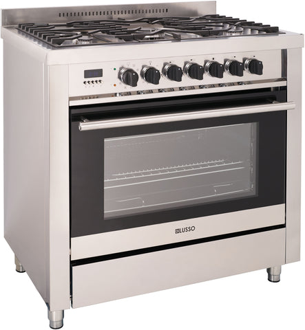 For the serious cook who wants the look of luxury. The prestige Di Lusso 90cm freestanding cooker offers a 5 burner gas cooktop with a triple ring wok burner on the side to make the most of your cooktop space, sturdy cast iron trivets and stainless steel coloured knobs. The 9 function electric oven comes with telescopic rails on all levels and a triple glazed door.